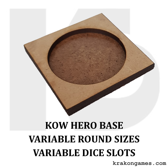 A 50mm square MDF base, measuring 50mm. Chose your round hole size and number of dice slots. Top layer is 3mm deep, bottom is 2mm. Provided unglued.